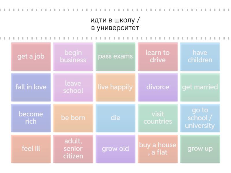 go to school / university - идти в школу / в университет, get a job - получить работу, be born - родиться, grow up - вырасти, leave school - выйти из школы, fall in love - влюбиться, get married - жениться, выйти замуж, buy a house , a flat - купить дом, квартиру, grow old - постареть, have children - иметь детей, learn to drive - учиться водить, live happily - жить счастливо, pass exams - сдать экзамены, begin business - начать бизнес, become rich - стать богатым, visit countries - посетить страны, feel ill - чувствовать себя больным, divorce - развестись, die - умереть, adult, senior citizen - взрослый, пожилой человек,