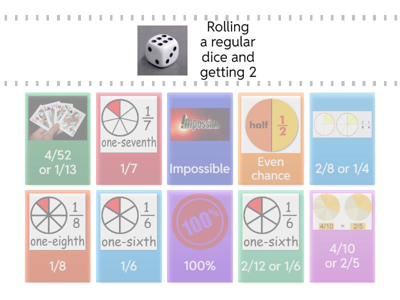 1/6 - Rolling a regular dice and getting 2, 1/7 - A birthday being on a Thursday, Even chance - Flipping a coin and getting tails, 4/52 or 1/13 - Picking a queen from a deck of cards, 4/10 or 2/5 - Picking a green marble from this bag, Impossible - St Patrick's Day being on August 9th, 2/12 or 1/6 - A month starting with the letter 'M', 1/8 - Landing on 5, 100% - A right angle having 90º, 2/8 or 1/4 - Landing on green,