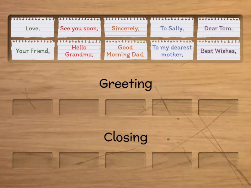 Greeting: Dear Tom,, To Sally,, Good Morning Dad,, Hello Grandma,, To my dearest mother,, Closing: Best Wishes,, Sincerely, , Your Friend,, See you soon,, Love,,
