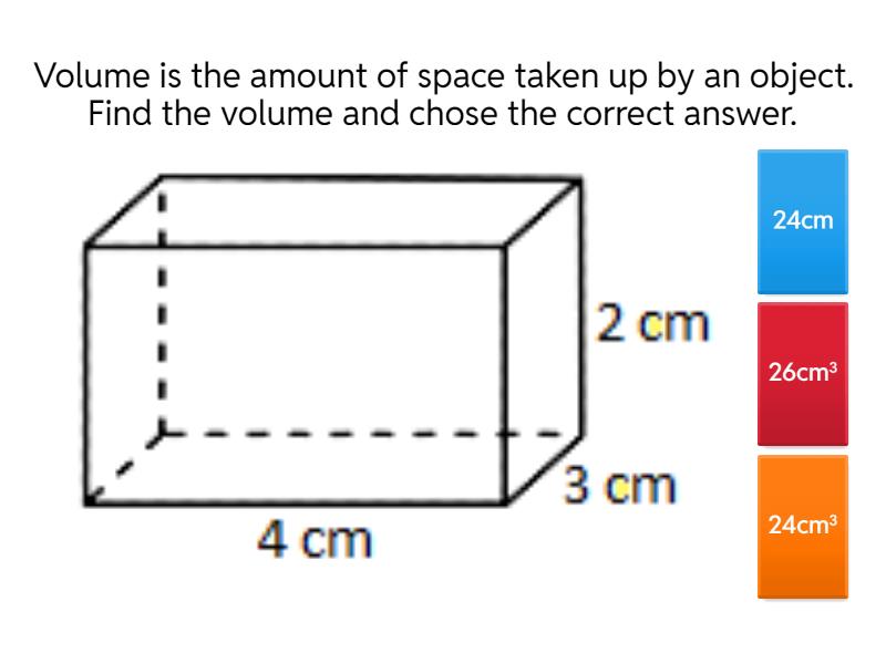1) Volume is the amount of space taken up by an object. Find the volume and chose the correct answer. a) 24cm b) 26cm3 c) 24cm3 2) Find the volume of the following. a) 120cm3 b) 124cm3 c) 120cm 3) Find the volume of the cuboid. a) 360mm b) 36m3 c) 36cm3 4) Find the volume of the cuboid a) 44m3 b) 40m3 c) 40cm3 5) Find the volume of the cuboid. a) 60m b) 60cm3 c) 60m3 6) To find the volume of a liquid, we use a measuring or graduated cylinder. Find the volume of the following a) 40ml b) 400ml c) 4ml 7) What is the volume of the liquid in the measuring cylinder to the nearest division? a) 5ml b) 4ml c) 4.1ml 8) What is the volume of the liquid in the measuring cylinder? a) 45.5ml b) 45ml3 c) 45ml 9) A rock was placed in a cylinder with 50ml of water. The water rose to 70ml. How much did the water level increase? a) 30ml b) 20ml c) 10ml 10) A block was put into 40ml of water. The water rose to 80ml. How much did it rise? a) 50ml b) 40ml c) 30ml