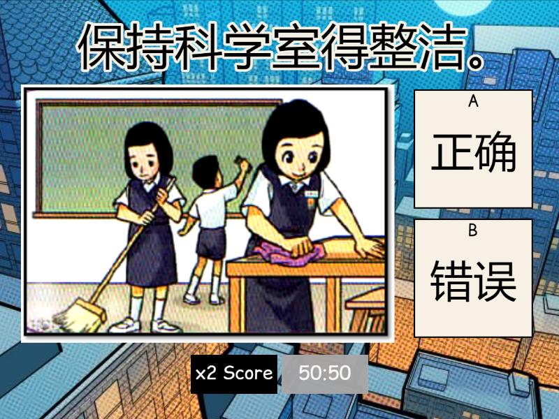 1) 进入科学室前必须先排队。 a) 正确 b) 错误 2) 必须要获得老师的允许才可以进行实验。 a) 错误 b) 正确 3) 可以带食物和饮料进入科学室。 a) 错误 b) 正确 4) 不可在科学室里嬉戏和追逐。 a) 正确 b) 错误 5) 发生意外不需要立刻向老师报告。 a) 正确 b) 错误 6) 保持科学室得整洁。 a) 正确 b) 错误 7) 我们可以擅自取走科学室里的用具。 a) 正确 b) 错误 8) 我们不可以擅自嗅科学室里的化学物品。 a) 正确 b) 错误 9) 不可将书包带进科学室。 a) 错误 b) 正确