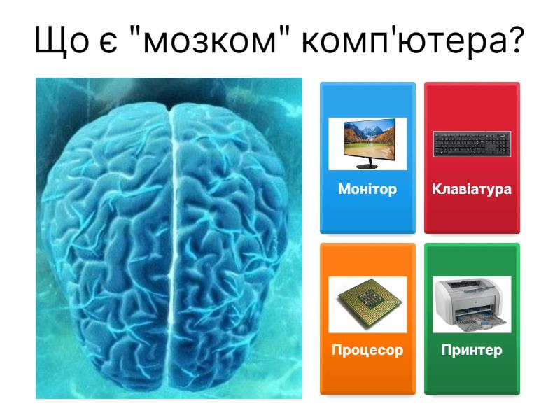 1) Що є "мозком" комп'ютера? a) Монітор b) Клавіатура c) Процесор d) Принтер 2) Який пристрій використовується для введення тексту в комп'ютер? a) Комп'ютерна мишка b) Клавіатура c) Принтер d) Мікрофон 3) Який пристрій показує зображення з комп'ютера? a) Сканер b) Принтер c) Монітор d) Колонки 4) Який пристрій використовується для друку документів з комп'ютера? a) Мишка b) Принтер c) Сканер d) Веб-камера 5) Який пристрій дозволяє нам чути звуки з комп'ютера? a) Клавіатура b) Колонки c) Монітор d) Джойстик 6) Який пристрій використовується для переміщення курсора на екрані комп'ютера? a) Мишка b) Принтер c) Сканер d) Указка