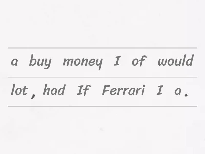 If I had a lot of money, I would buy a Ferrari. , If I spoke Chinese, I would travel to China., If I were an actor, I would win an Oscar. , If I won the lottery, I would buy a big house. , If I had a car, I would travel more often., If I lived in the country, I would be relaxed. , If I saw a bear, I would pretend to be dead. , If I were a chef, I would cook delicious food., If I had an accident, I would stop working., If I were 65 years old, I would retire. , If I got married, I would have a happy family., If I saw a ghost, I would scream., If I drove a Ferrari, I would drive incredibly fast., If I drove a Ferrari, I would be popular., If I lived in Hollywood, I would meet actors and celebrities., If I had one million dollars, I would buy a big house.,