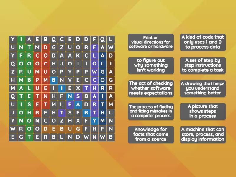 Troubleshoot - to figure out why something isn't working, Flowchart - A picture that shows steps in a process, Computer - A machine that can store, process, and display information, Binary - A kind of code that only uses 1 and 0 to process data, Diagram - A drawing that helps you understand something better, Algorithm - A set of step by step instructions to complete a task, Debug - The process of finding and fixing mistakes in a computer process, Information - Knowledge for facts that come from a source, Test - The act of checking whether software meets expectations, Document - Print or visual directions for software or hardware,