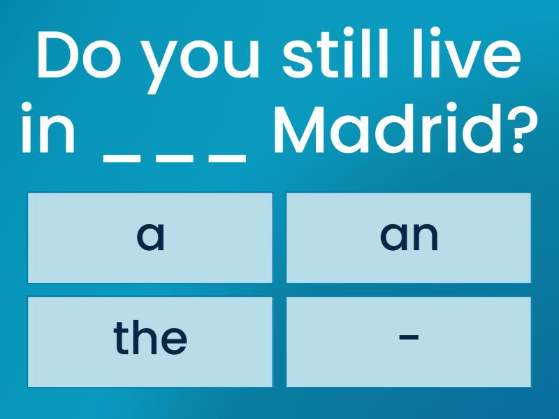 1) Do you still live in ___ Madrid? a) a b) an c) the d) - 2) Carol's father works as ___ electrician. a) a b) an c) the d) - 3) My grandmother likes ___ flowers very much. a) a b) an c) the d) - 4) I always listen to the radio in ___ morning. a) a b) an c) the d) - 5) There is ___ new English book on the desk. a) a b) an c) the d) - 6) The cheetah is ___ fastest animal in the world. a) a b) an c) the d) - 7) Peter has ___ aunt in Berlin. a) a b) an c) the d) - 8) Look! There's ___ bird flying out the window. a) a b) an c) the d) - 9) Last year I gave my mother ___ bracelet for her birthday. a) a b) an c) the d) - 10) Tom is in ___ bathroom. He's having a bath. a) a b) an c) the d) - 11) Enjoy your holiday and don't forget to send me ___ message when you get there! a) a b) an c) the d) - 12) Our children go to ___ school by bus. a) a b) an c) the d) - 13) ___ roses are my favorite flowers. a) a b) an c) the d) - 14) Would you like ___ cup of tea? a) a b) an c) the d) - 15) I went to see ___ doctor because I can't sleep at night. a) a b) an c) the d) - 16) He is ___ best student in his college. a) a b) an c) the d) - 17) Could you close ___ door, please? It’s really cold. a) a b) an c) the d) - 18) I love ___ panda bears; they are so cute! a) a b) an c) the d) -