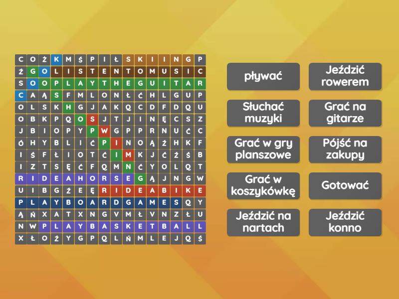 Go shopping - Pójść na zakupy, Play basketball - Grać w koszykówkę, Ride a bike - Jeździć rowerem, Cook - Gotować, Listen to music - Słuchać muzyki, Play board games - Grać w gry planszowe, Skiing - Jeździć na nartach, Play the guitar - Grać na gitarze, Ride a horse - Jeździć konno, Swim - pływać,