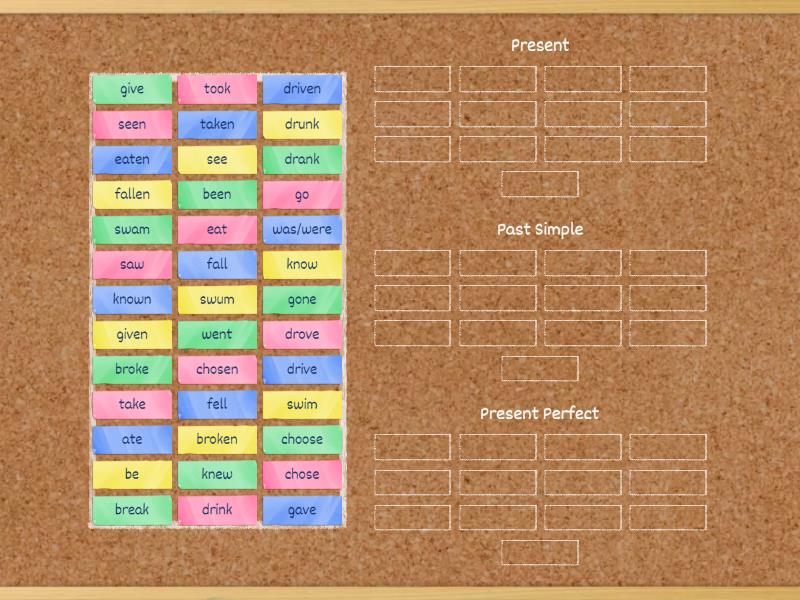 Present: go, see, take, eat, drink, know, break, be, choose, drive, fall, give, swim, Past Simple: went, saw, took, ate, drank, knew, broke, was/were, chose, drove, fell, gave, swam, Present Perfect: gone, seen, taken, eaten, drunk, known, broken, been, chosen, driven, fallen, given, swum,