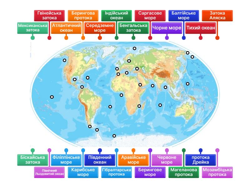 Філіппінське море, Саргасове море, Аравійське море, Бенгальська затока, Червоне море, протока Дрейка, Мексиканська затока, Середземне море, Чорне море, Гібралтарська протока, Гвінейська затока, Берингова протока, Магеланова протока, Мозамбіцька протока, Балтійське море, Біскайська затока, Затока Аляска, Берингове море, Карибське море, Тихий океан, Атлантичний океан, Індійський океан, Північний Льодовитий океан, Південний океан.