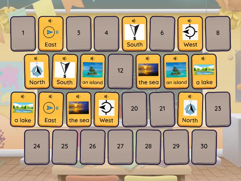 North, South, East, West, an island, a lake, the sea, the sky, a river, trees, hill, clouds, a mountain, a field, flowers ,