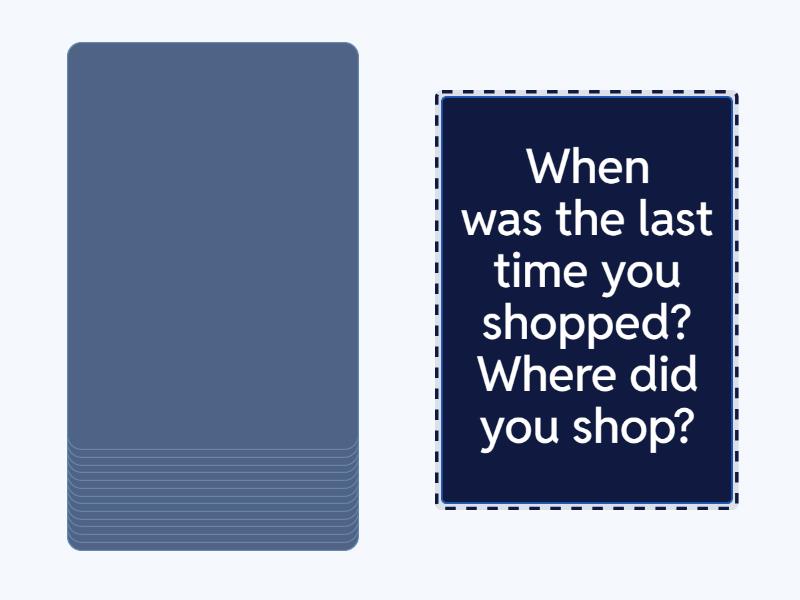 Who cooked last night's dinner for you?, Did you like the last movie you saw?, Did you walk here today?, What did you last thank someone for?, When was the last time you shopped? Where did you shop?, What did you do yesterday?, Did you exercise yesterday?, What interesting topic did you talk about recently?, Which games or sports did you play this month?, When did you last travel? Where did you go?, The last time you ordered a pizza, who did you share it with?, How many times did you brush your teeth yesterday?, What was the last present you received?, Can you remember the last song you listened to?, What did you last bake?.