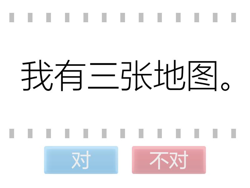 对: 我有三张地图。, 我22岁。, 这是米山的地图。, 那是她的中国地图。, 不对: 我有三个地图。, 我有三支地图。, 我22大。, 我岁22。, 这是米山地图。, 这是地图米山。, 那是她的中国的地图。, 那是她中国地图。,