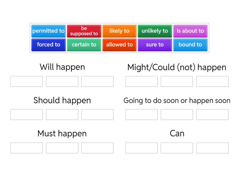 Will happen: bound to, certain to, sure to, Might/Could (not) happen : likely to, unlikely to, Should happen : be supposed to, Going to do soon or happen soon: is about to, Must happen: forced to, Can: allowed to, permitted to,
