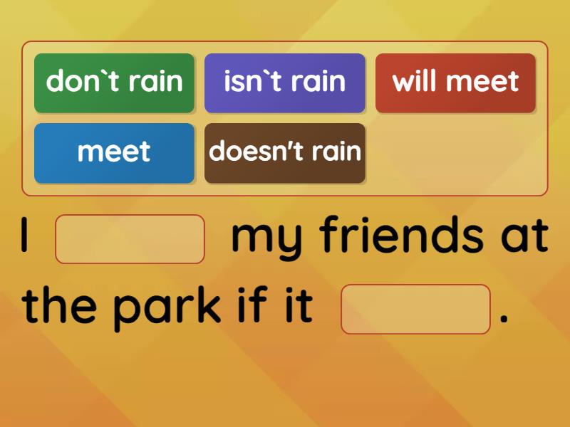 I ____ my friends at the park if it ____. They ____ a movie tonight if they ____ their homework. My mom ____ pasta for lunch tomorrow if she ____ all the ingredients. I ____ a book before bed if ____ not too tired. We ____ the dog this morning if it’s not too cold. We ____ a new Netflix series tonight if ____ available.