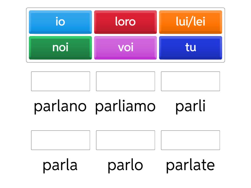io - parlo, tu - parli, lui/lei - parla, noi - parliamo, voi - parlate, loro - parlano,