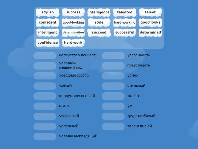 confidence - уверенность, confident - уверенный, determination - целеустремленность, determined - целеустремленный, good-looking - хорошо выглядящий, good looks - хороший внешний вид, hard work - усердная работа, hard-working - трудолюбивый, intelligence - ум, intelligent - умный, style - стиль, stylish - стильный, talent - талант, talented - талантливый, success - успех, successful - успешный, succeed - преуспевать,