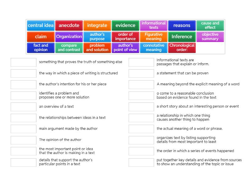 informational texts - Informational texts are passages that explain or inform., Inference - o come to a reasonable conclusion based on evidence found in the text, central idea - the most important point or idea that the author is making in a text, objective summary - an overview of a text, fact and opinion - a statement that can be proven, anecdote - a short story about an interesting person or event, Figurative meaning - the actual meaning of a word or phrase., connotative meaning - A meaning beyond the explicit meaning of a word, Organization - the way in which a piece of writing is structured, Chronological order: - the order in which a series of events happened, cause and effect - a relationship in which one thing causes another thing to happen, compare and contrast - the relationships between ideas in a text, order of importance - organizes text by listing supporting details from most important to least, problem and solution - identifies a problem and proposes one or more solution, author's purpose - the author’s intention for his or her piece, author's point of view - The opinion of the author, integrate - put together key details and evidence from sources to show an understanding of the topic or issue , claim - main argument made by the author, reasons - details that support the author’s particular points in a text, evidence - something that proves the truth of something else,