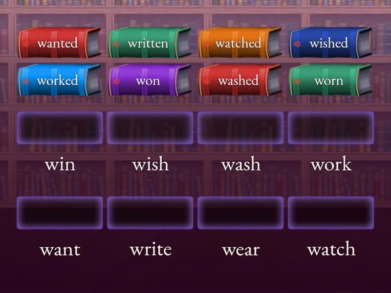 worn - wear, won - win, written - write, wanted - want, washed - wash, watched - watch, wished - wish, worked - work,