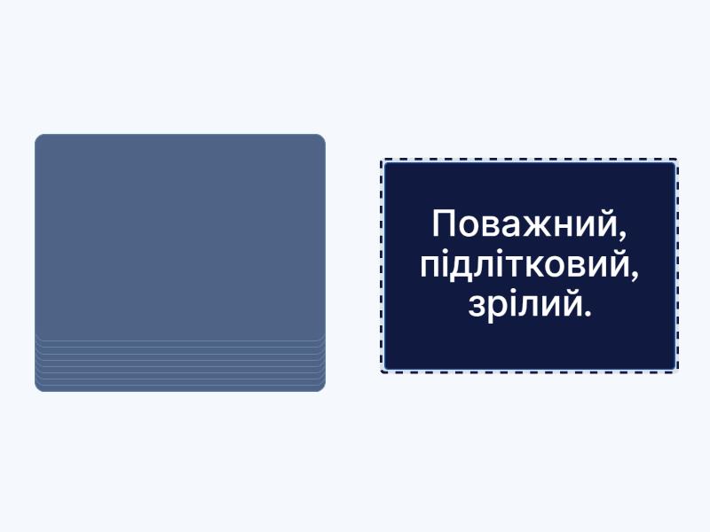 Виразні, широко поставлені, розкосі., Проникливий, лагідний, насторожений., Насуплені, густі, прямі., Рішучий, теплий, привітний., Смагляве, вродливе, бліде., Поважний, підлітковий, зрілий., Широкий, рівний, маленький., Тендітна, худорлява, струнка., Уважний, чемний, запальний., Зімкнуті, спокусливі, пухкі..