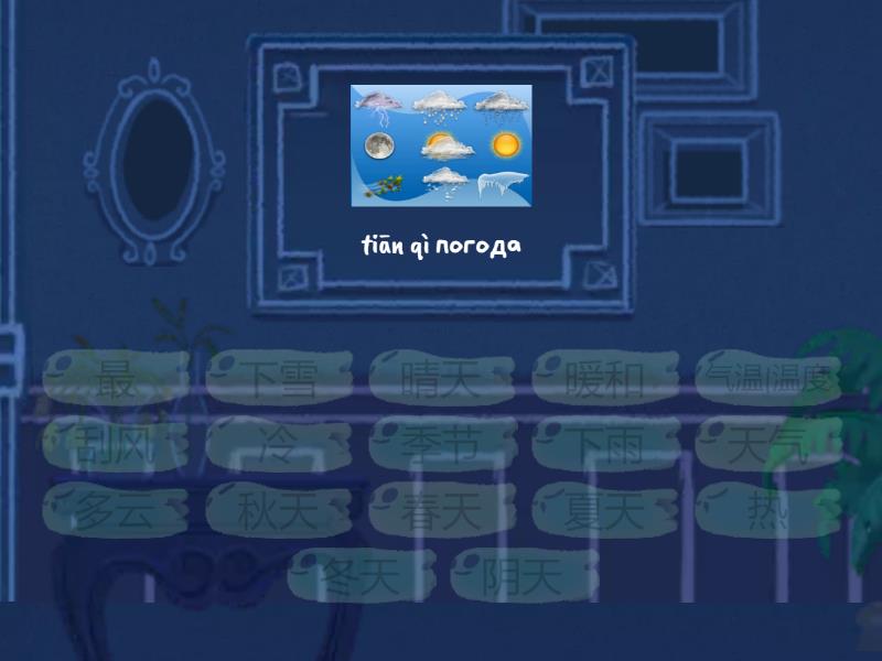 天气 - tiān qì погода, 热 - reжаркий, 冷 - lěng холодно, 下雨 - xià yǔ дождь, 下雪 - xià xuě снег, 多云 - duō yún облачно, 晴天 - qíng tiān солнечно, 阴天 - yīn tiān пасмурно, 暖和 - nuǎn huo тепло, 刮风 - gua fēng дует ветер, 气温|温度 - qì wēn|wēn dù температура, 冬天 - dōng tiān зима, 春天 - chūn tiān весна, 夏天 - xià tiān лето, 秋天 - qiū tiān осень, 季节 - jì jié время года, 最 - самый,