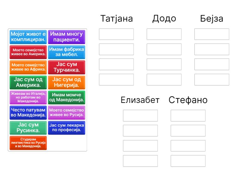 Татјана: Јас сум Русинка., Студирам лингвистика во Русија и во Македонија., Моето семејство живее во Русија., Додо: Јас сум од Нигерија., Моето семејство живее во Африка., Бејза: Јас сум Турчинка., Јас сум лекарка по професија., Имам многу пациенти., Елизабет: Имам момче од Македонија., Јас сум од Америка., Моето семејство живее во Америка., Стефано: Живеам во Италија, но работам во Македонија., Имам фабрика за мебел., Мојот живот е комплициран., Често патувам во Македонија.,
