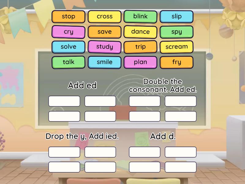 Add ed: scream, talk, cross, blink, Double the consonant. Add ed.: slip, trip, plan, stop, Drop the y, Add ied.: cry, fry, spy, study, Add d.: smile, solve, dance, save,