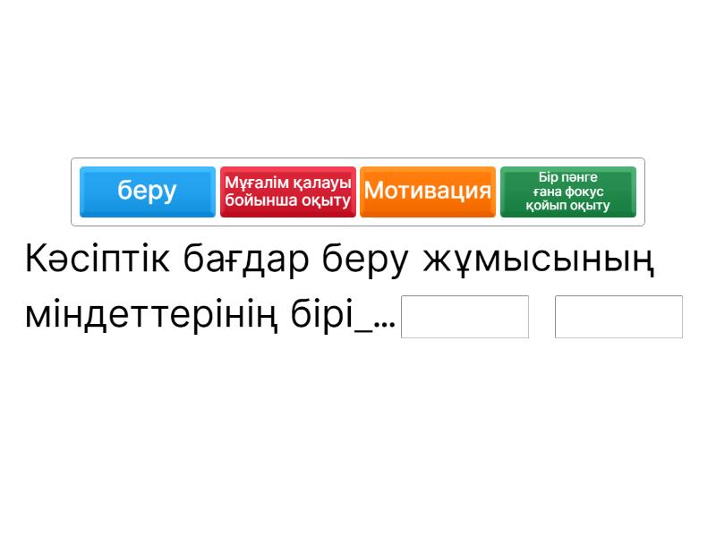 Кәсіптік бағдар беру жұмысының міндеттерінің бірі_...____ ____ Кәсіптік ақпарат көздері ____ ____ Кәсіптік бағдар беруде ____ жүргізіледі Кәсіптік бағдар беру-... ____ Жеке қабілеттерін, бейімділігін және қызығушылығын ескереді Арнайы әдістер арқылы оқушының белгілі бір мамандыққа жарамдылығын анықтау, денсаулық жағдайын ескеру-... ____ Кәсіптік бағдар берудің негізгі әдістері ____ ____ ____ Кәсіптік бағдар берудің заманауи тенденциялары ____