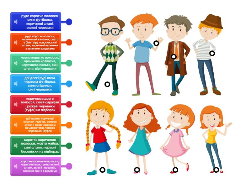 дві довгі руді коси, червона футболка, синя спідниця, сині черевики, коричневе довге волосся, синій сарафан і рожеві черевики (туфлі) на підборах, дві короткі коричневі косички і чубчик, рожева сукня з синім комірцем та манжетами, червоні черевички (туфлі), коротке коричневе волосся, жовта майка, сині штани, червоні босоніжки на підборах, коротке коричневе волосся, чорні окуляри, темно-зелені штани, зелені черевики, зелений светр з ромбами, руде коротке волосся, синя футболка, коричневі штані, зелені черевики, чорне коротке волосся, оранжева краватка, коричневе пальто, сині штани, сірі черевики, руде коротке волосся, коричневий капелюх, светр у білу і сіру полоски, сині штани, коричневі черевики з зеленими шнурками .