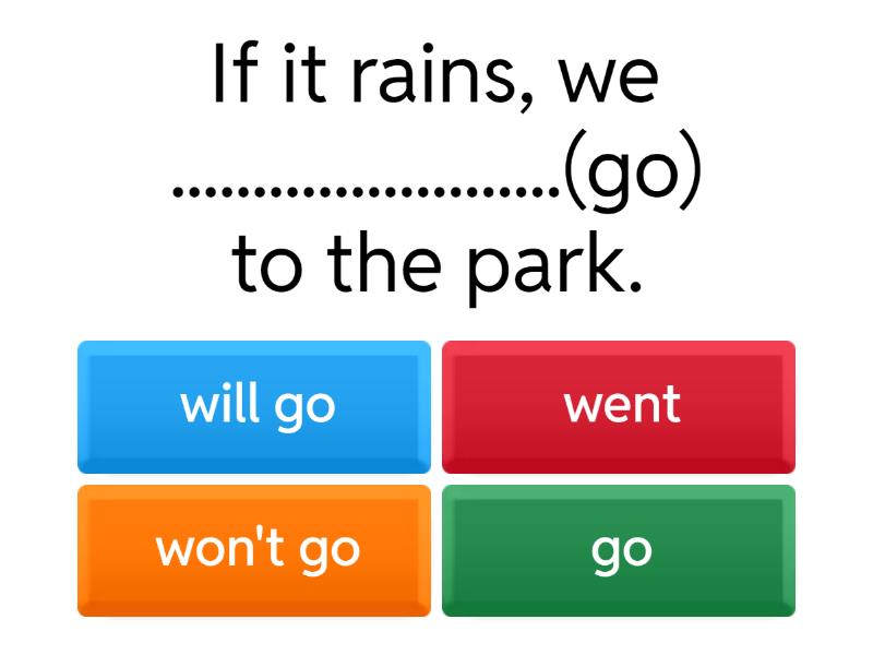 1) If it rains, we ........................(go) to the park. a) will go b) went c) won't go d) go 2) If you see John, .............................(tell) him to call me. a) you will tell b) have told c) you told d) tell 3) If you study hard, you ........................(pass) the final exam. a) may pass b) pass c) will have passed d) passed 4) If you clean your room, you ..........................(go) to the party. a) could go b) will go c) should go d) went 5) If Elena goes to London, she ........................(be) very happy. a) were b) could be c) has been d) will be 6) If Natalie plays against Veronica, she .....................(lose) a) could have lost b) loses c) will lose d) lost 7) Unless you sleep enough, you .......................(be) tired. a) will be b) were c) would be d) should be 8) If Jessica eats healthy, she................................(lose) weight. a) may lose b) has lost c) lost d) loses 9) If Nick ..............................(travel) to Paris, he will certainly visit the Eiffel Tower. a) will travel b) is travelling c) could have travelled d) travels 10) If Bill ................(lose) his passport, he won't go to Bali. a) has lost b) loses c) lost d) is losing
