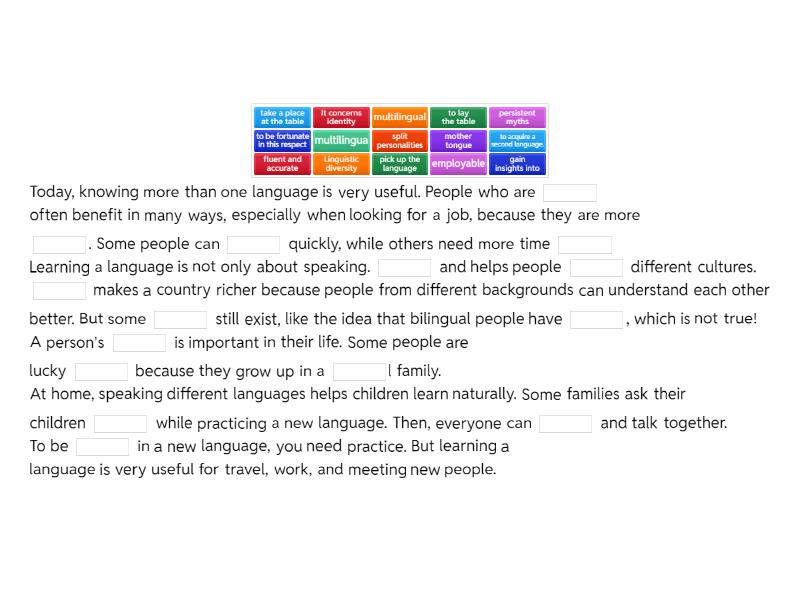 Today, knowing more than one language is very useful. People who are ____ often benefit in many ways, especially when looking for a job, because they are more ____. Some people can ____ quickly, while others need more time ____ Learning a language is not only about speaking. ____ and helps people ____ different cultures. ____ makes a country richer because people from different backgrounds can understand each other better. But some ____ still exist, like the idea that bilingual people have ____, which is not true! A person’s ____ is important in their life. Some people are lucky ____ because they grow up in a ____l family. At home, speaking different languages helps children learn naturally. Some families ask their children ____ while practicing a new language. Then, everyone can ____ and talk together. To be ____ in a new language, you need practice. But learning a language is very useful for travel, work, and meeting new people.