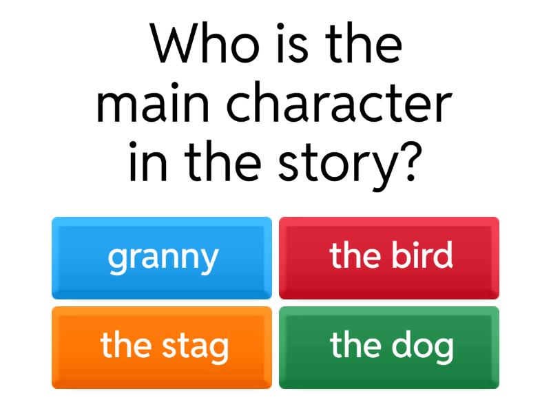 1) Who is the main character in the story? a) granny b) the bird c) the stag d) the dog 2) Why did the bird flies out of the cage? a) The bird is hungry? b) The bird wants to play? c) The bird is looking for a friend? d) The cat is chasing the bird. 3) Which animal did the bird see as it flies past the farm? a) the stag b) the cat c) the fox d) the granny 4) Why did the bird hides in the bird stand? a) The bird likes to be there. b) The bird thinks it is a swing. c) The bird is safe there. d) The bird thinks there will be food there. 5) Where did the bird eventually return to? a) The bird heads home to granny. b) The bird flies on a tree. c) The bird continues flying. d) The bird stays at the bird stand.