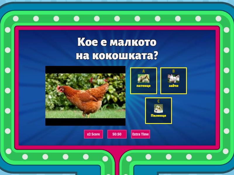 1) Кое е малкото на кокошката? a) патенце b) зайче c) Пиленце 2) Кое е малкото на козата? a) козичка/яре b) конче c) теле 3) Кое е малкото на овцата? a) прасенце b) конче c) агне 4) Кое е малкото на прасето? a) прасенце b) патенце c) зайче 5) Кое е малкото на кравата? a) теле b) конче c) котенце