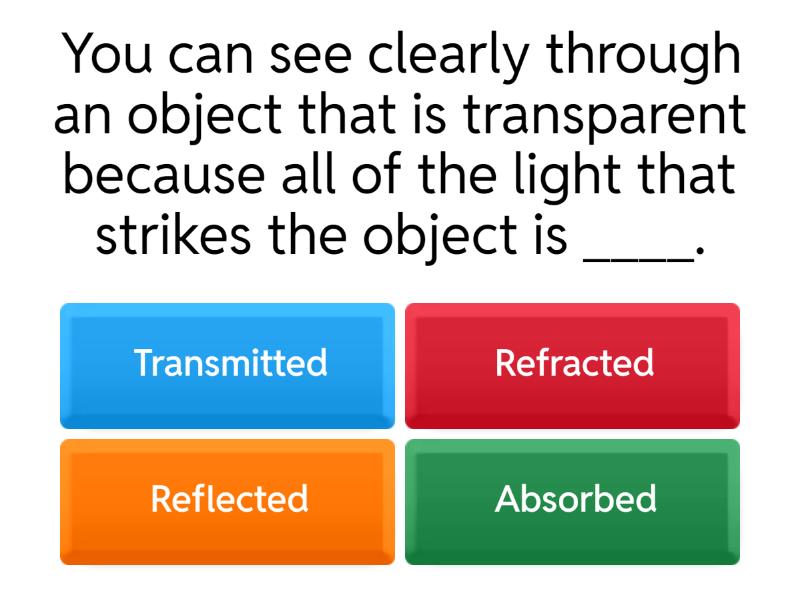 1) You can see clearly through an object that is transparent because all of the light that strikes the object is ____. a) Transmitted b) Refracted c) Reflected d) Absorbed 2) The shortest wavelength of visible light appears to the human eye is the color ____. a) Red b) Magenta c) Violet d) Yellow 3) Why does a blackboard appear black? a) It absorbs only black wavelengths of visible light b) It reflects only black wavelengths of visible light c) It absorbs all wavelengths of visible light d) It reflects all wavelengths of visible light 4) rainbows form because of the ______ of visible light a) Reflection b) Absorption c) Transmission d) Refraction 5) Which of the following colors is a primary pigment color? a) Red b) Blue c) Cyan d) Green 6) The ____ of a transverse wave is the distance between two crests or between two troughs a) Wavelength b) Object c) Longitudinal 7) In all types of _____ wave, particles of the medium vibrate in the same direction that the wave travels a) Mechanical b) Transverse c) Longitudinal 8) In all types of _______ wave, particles of the medium vibrate at right angles to the direction that the wave travel a) mechanical b) Transverse c) Longitudinal 9) The matter through which a mechanical wave travels is called _____ a) Medium b) Vessel c) Tunnel 10) ______ wave is a disturbance in matter that transfers energy from place to place a) mechanical b) Transverse c) Longitudinal 11) Light waves are one of the ways that energy from the Sun ______ to the Earth a) Hides b) Travels c) Blocks 12) because of how light travels, it explains how ______ are formed on sunny days. a) Shadows b) Images c) Reflections d) Refractions 13) because of how light travels, it explains how ______ are formed in cameras a) Shadows b) Images c) Reflections d) Refractions 14) because of how light travels, it explains why we see _________ in mirrors. a) Shadows b) Images c) Reflections d) Refractions 15) Choose which describes LIGHT, check all applies a) Transverse wave b) Longitudinal wave c) Faster of these 2 waves d) Mechanical wave, can travel only through matter 16) Choose which describes SOUND, check all applies a) Transverse wave b) Longitudinal wave c) Faster of these 2 waves d) Mechanical wave, can travel only through matter 17) Choose which describes LIGHT, check all applies a) Mechanical wave, can travel only through matter b) It travels very fast c) electromagnetic wave, can travel through both matter and empty space d) It moves because of vibration 18) Choose which one describes SOUND, check all applies a) Mechanical wave, can travel only through matter b) It travels very fast c) electromagnetic wave, can travel through both matter and empty space d) It moves because of vibration 19) It is the highest point of a wave a) Amplitude b) Crest c) Star d) Trough 20) It is the highest point of a wave a) Amplitude b) Crest c) Star d) Trough 21) The height of a wave a) Amplitude b) Crest c) Star d) Trough 22) The distance between two crests or between two troughs a) Frequency b) Speed c) Wavelength 23) Number of waves that pass a certain point in one second a) Frequency b) Speed c) Wavelength 24) Distance that one wave travels in one second a) Frequency b) Speed c) Wavelength 25) It is a form of wave energy a) Water b) Light c) Fire 26) Light waves can more through BOTH matter and empty space a) True b) False 27) Light is an _____ wave a) Electromagnetic b) Spiral c) Straight 28) The first thing that God created was sound. a) True b) False (Light) 29) Light waves travel slower than sound waves do a) True b) False (travel faster) 30) All waves have the same basic properties a) True b) False 31) Waves that move perpendicular to the way that the matter is moving are called transverse waves a) True b) False 32) Identify what is A in the image a) amplitude b) Crest c) Trough d) Wavelength 33) Identify what is B in the image a) amplitude b) Crest c) Trough d) Wavelength 34) Identify what is C in the image a) amplitude b) Crest c) Trough d) Wavelength 35) Identify what is D in the image a) amplitude b) Crest c) Trough d) Wavelength 36) The different colors of light are called the ___ a) visible spectrum b) Visible colors c) Invisible spectrum 37) It is the bending of light as it passes from one medium into another a) Direction b) Refraction c) Reflection d) Absorption 38) The speed and ____ of light may change, but it's path will always be straight. a) Direction b) Refraction c) Reflection d) Absorption 39) Prisms separate light into colors by the process of ___. a) Direction b) Refraction c) Reflection d) Absorption 40) When sunlight passes through raindrops and bends into the different color of the visible spectrum, refraction happens and causes a _____. a) Tornado b) Sunshine c) Rainbow d) Red color 41) The first letters of the colors in the visible spectrum spell the name _____. a) ELROY b) BELZEROY c) ROYGBlV d) ROYGRRRR 42) ____ objects do not let light pass through them. a) Opaque b) Absorb c) Reflect 43) Opaque objects _____, or soak in, some wavelengths of light. a) Opaque b) Absorb c) Reflect 44) What are the colors in the visible spectrum? a) Air b) Red c) Green d) Blue e) Orange f) Magenta 45) Light makes things visible, or able to be seen. a) True b) False 46) Light always travels in a bended line. a) True b) False (straight line) 47) Light always travels in a straight line. a) True b) False 48) The speed of light changes as light enters different ____ a) Colors b) Water c) Mediums 49) The colors in the visible spectrum are IN ORDER by their wavelengths. a) True b) False 50) It happens when light bounces off an object. a) Reflection b) Refraction c) Absorption 51) The color that is seen depends on which colors of light are reflected to your eyes and which are absorbed a) True b) False 52) When all of the colors of light are reflected, you see black. a) True b) False ( you see white) 53) When all of the colors of light are absorbed, you see black a) True b) False 54) The secondary colo