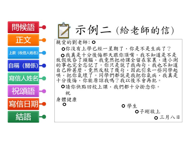 上款(收信人姓名), 問候語, 正文, 結語, 祝頌語, 自稱(關係), 寫信人姓名, 寫信日期.