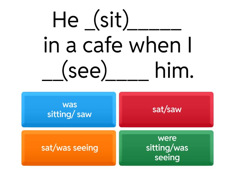 1) He _(sit)_____ in a cafe when I __(see)____ him. a) was sitting/ saw b) sat/saw c) sat/was seeing d) were sitting/was seeing 2) The boy __(fall)____ while he __(run)____. a) fell down/ran b) was falling down/was running c) fell down/was running d) was falling down/ran 3) When the war __(begin)____ we ______ in London. a) began/lived b) was beginning/was living c) began/were living d) was beginning/lived 4) The light __(go out)____ while I __(have)____ tea. a) went out/had b) went out/was having c) was going out/was having d) was going out/had 5) My friends ______ when I ______ into the room. a) were singing/come b) were singing/was coming c) sang/came d) were singing/came 6) He __(eat)____ his dinner when I __(call)____ him. a) ate/called b) ate/was calling c) was eating/was calling d) was eating/called 7) She ___(study)___at school when the earthquake _____(happen) ______ . a) study/happen b) was studying/was happenning c) was studying/happened d) studying/happened 8) When the phone __(ring)____ I (have) ______ a bath. a) rang/had b) was ringing/was having c) was ringing/had d) rang/was having 9) They (___ski)___ when they _____(see)_______ an avalanche. a) skied/seed b) was skiing / saw c) skied/ were seeing d) were skiing/ saw 10) The wildfire ______(arrive) while the people _____(sleep)_____. a) arrive/ sleeped b) arrived/ was sleeping c) arrived/ were sleeping d) was arriving/ slept