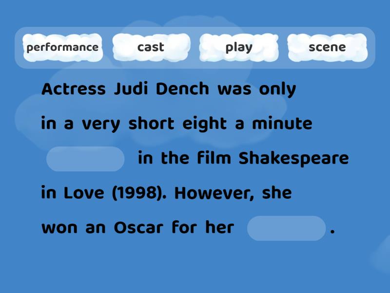 Actress Judi Dench was only in a very short eight a minute ____ in the film Shakespeare in Love (1998). However, she won an Oscar for her ____. In the film Kind Hearts and Coronets (1949), actor Alec Guinness ____ eight different ____ , including an old soldier, a young photographer, and an old lady. The Wolf of Wall Street (2013), which ____ Leonardo DiCaprio and Matthew McConaughey, is ____ in New York but was actually filmed in Spain. Memento (2000) is a film with a very complicated ____. It tells the story backwards from the point of view of a man who can't remember anything. The ____ includes Guy Pearce, Joe Pantoliano and Carrie-Anne Moss.