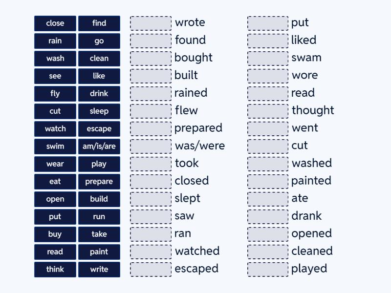 play - played, like - liked, go - went, drink - drank, eat - ate, watch - watched, write - wrote, buy - bought, think - thought, read - read, find - found, swim - swam, prepare - prepared, fly - flew, run - ran, escape - escaped, sleep - slept, build - built, see - saw, am/is/are - was/were, take - took, cut - cut, put - put, clean - cleaned, wear - wore, wash - washed, rain - rained, paint - painted, open - opened, close - closed,