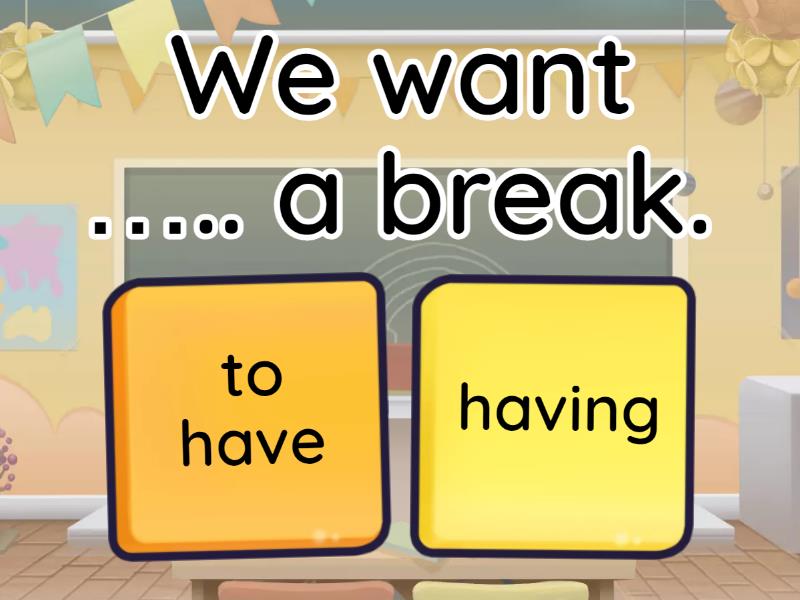 1) We want ….. a break. a) to have b) having 2) I would like…. something. a) to eat b) eating 3) The children learned…. in the tents. a) to sleep b) sleeping 4) He decided….. sausages for lunch. a) to eat b) eating 5) I hate …. mountains. a) climbing b) to climb 6) He can’t stand… his room. a) tidying b) to tidy 7) She doesn’t mind…. dinner. a) cooking b) to cook 8) I’m looking forward to…. my grandparents. a) seeing b) to see 9) I like ….. computers games. a) playing b) to play 10) She enjoys ….. chocolate and sweets. a) eating b) to eat