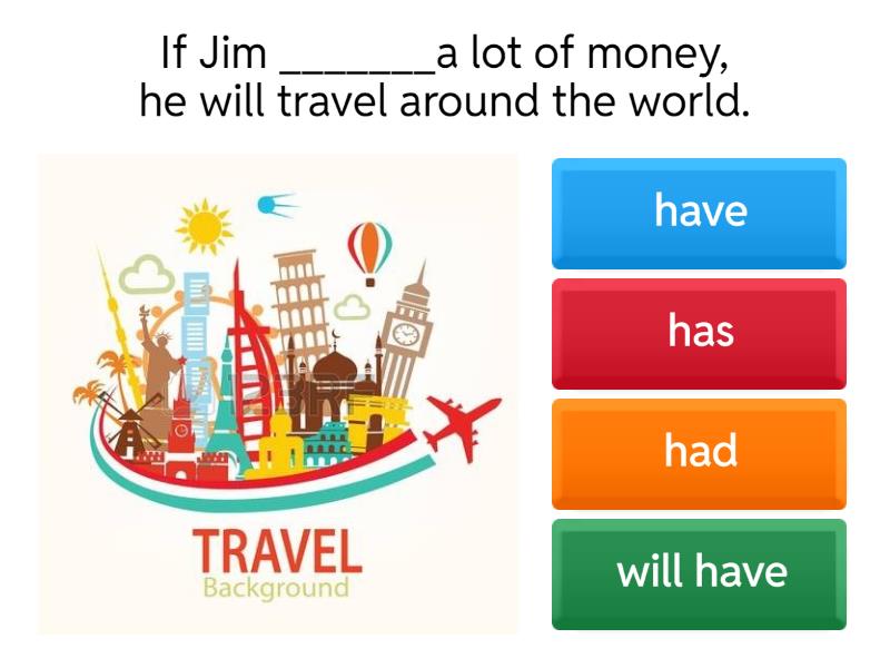 1) If Jim _______a lot of money, he will travel around the world. a) have b) has c) had d) will have 2) If Jenny __________her homework, she will go to the cinema. a) do b) does c) did d) will do 3) If Miguel gets good marks, his mother__________happy. a) will b) will be c) be d) is 4) If Ana goes to the party, she__________her friends. a) will sees b) will saw c) will see d) sees 5) I will go to the beach if it ________sunny and hot. a) are b) is c) will is d) will are 6) If my mum says it's OK, I _________video games. a) will b) will play c) plays d) played 7) Peter _________a new mobile phone if it isn't expensive. a) will buys b) will buy c) buy d) buys 8) If I ________to Cuzco, I'll visit Machu Picchu. a) goes b) go c) will go d) went 9) Elena ________fun if she goes to the party. a) will has b) will have c) has d) have 10) If Pedro doesn't study, he _______ the exam. a) will passes b) won't pass c) won't passes d) passes