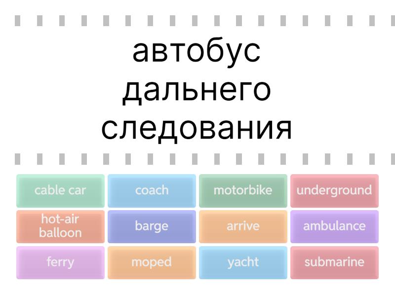 coach - автобус дальнего следования, underground - метро, moped - мопед, motorbike - мотоцикл, ferry - паром, barge - грузовой корабль, cable car - вагон фуникулера (подъемник), hot-air balloon - воздушный шар, ambulance - скорая помощь, yacht - яхта, submarine - подводная лодка, arrive - прибывать,