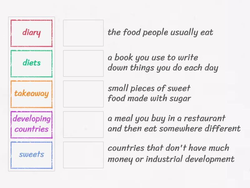 developing countries - countries that don't have much money or industrial development, sweets - small pieces of sweet food made with sugar, diary - a book you use to write down things you do each day, diets - the food people usually eat, takeaway - a meal you buy in a restaurant and then eat somewhere different,