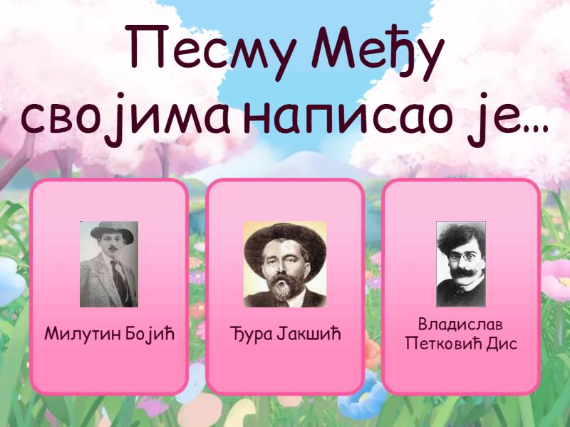 1) Песму Међу својима написао је... a) Милутин Бојић b) Ђура Јакшић c) Владислав Петковић Дис 2) Песма Међу својима је... a) љубавна b) родољубива c) елегија 3) Елегија је... a) врста љубавне песме b) песма у којој се износе тужна, сетна осећања и расположења c) лирско-епска врста 4) Тема песме је... a) туга песника за својима, за отаџбином и срећним животом b) страхоте Првог светског рата c) љубав двоје младих 5) Означи главни мотив у песми. a) звезда b) брига за породицу c) рат 6) Одреди врсту строфе. a) дистих b) терцет c) катрен d) квинта 7) Одреди риму. a) парна b) укрштена c) обгрљена 8) Одреди врсту стиха у песми. a) десетерац b) осмерац c) дванаестерац 9) Песму Међу својима Дис је написао током свог избеглиштва у... a) Паризу b) Риму c) Солуну 10) Песма Међу својима настала је за време... a) Првог светског рата b) Другог светског рата 11) Коме се песник обраћа метафорама "моја лепа звезда", "моја дивна зора", "мој предео млади"? a) Србији b) мајци c) супрузи 12) Коју стилску фигуру препознајеш у стиху "два наша цвета из четири рата"? a) персонификацију b) метафору c) контраст 13) Препознај стилску фигуру у стиховима "Напољу је видно, као пред свитање. Ко да ће се дићи гробови и људи." a) поређење b) метафора c) ономатопеја 14) Означи оно што се односи на лирског субјекта. a) клонуо b) усхићен c) забринут d) немаран e) усамљен f) несрећан 15) Поступак којим се недовршена мисао из једног стиха или из једне строфе преноси у следећи стих или следећу строфу назива се... a) прекорачење b) опкорачење c) искорачење