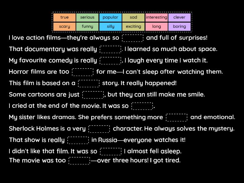 I love action films—they're always so ____ and full of surprises! That documentary was really ____. I learned so much about space. My favourite comedy is really ____. I laugh every time I watch it. Horror films are too ____ for me—I can’t sleep after watching them. This film is based on a ____ story. It really happened! Some cartoons are just ____, but they can still make me smile. I cried at the end of the movie. It was so ____. My sister likes dramas. She prefers something more ____ and emotional. Sherlock Holmes is a very ____ character. He always solves the mystery. That show is really ____ in Russia—everyone watches it! I didn’t like that film. It was so ____ I almost fell asleep. The movie was too ____—over three hours! I got tired.