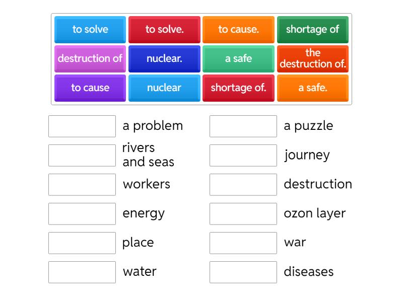 nuclear - war, to cause - diseases, destruction of - rivers and seas, to solve - a puzzle, shortage of - water, a safe - journey, nuclear. - energy, to cause. - destruction, the destruction of. - ozon layer, to solve. - a problem, shortage of. - workers, a safe. - place,