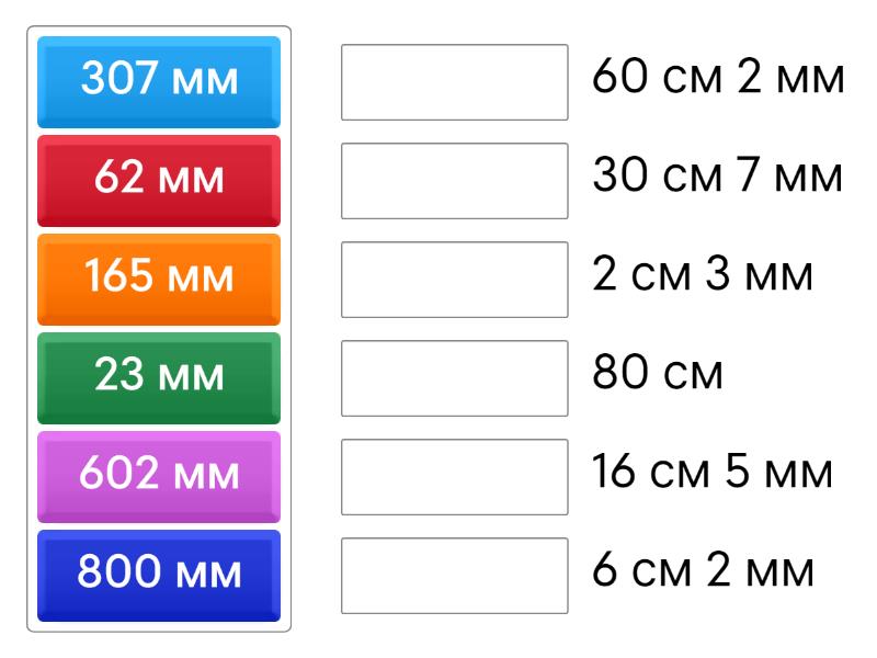 23 мм - 2 см 3 мм, 165 мм - 16 см 5 мм, 800 мм - 80 см, 602 мм - 60 см 2 мм, 62 мм - 6 см 2 мм, 307 мм - 30 см 7 мм,
