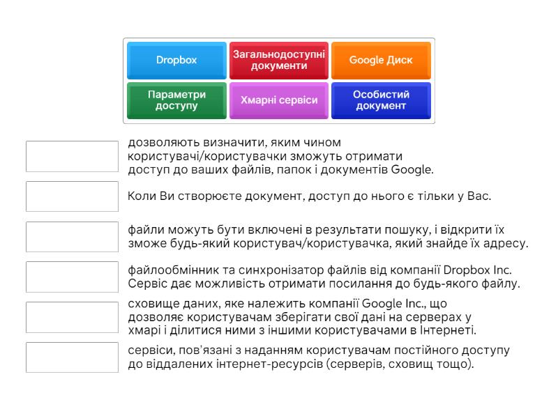 Хмарні сервіси - сервіси, пов’язані з наданням користувачам постійного доступу до віддалених інтернет-ресурсів (серверів, сховищ тощо)., Dropbox - файлообмінник та синхронізатор файлів від компанії Dropbox Inc. Сервіс дає можливість отримати посилання до будь-якого файлу., Google Диск - сховище даних, яке належить компанії Google Inc., що дозволяє користувачам зберігати свої дані на серверах у хмарі і ділитися ними з іншими користувачами в Інтернеті., Параметри доступу - дозволяють визначити, яким чином користувачі/користувачки зможуть отримати доступ до ваших файлів, папок і документів Google., Загальнодоступні документи - файли можуть бути включені в результати пошуку, і відкрити їх зможе будь-який користувач/користувачка, який знайде їх адресу., Особистий документ - Коли Ви створюєте документ, доступ до нього є тільки у Вас.,