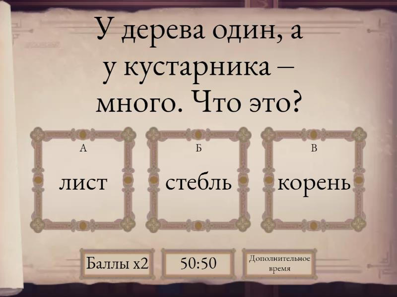 1) У дерева один, а у кустарника – много. Что это? a) лист b) стебль c) корень 2) Растет – зеленеет, летит – пожелтеет, упадет – почернеет. Что это? a) лист b) цветок c) бабочка 3) У какого хвойного дерева иголки несут попарно? a) ёлка b) лиственница c) Сосна 4) Сколько крыльев у насекомых? a) 2 b) 4 c) 6 5) Назови жука по описанию. Черный жук с металлическим блеском и с фиолетовым оттенком. a) жужелица b) бронзовка c) жук-носорог 6) Какие насекомые держат тлей в собственном жилище, охранят их и доят? a) стрекозы b) муравьи c) божьи коровки 7) Назовите пресмыкающийся, который в случае опасности отбрасывает свой хвост. a) уж b) ящерица c) варан 8) Единственной ядовитой змеёй, обитающей на территории нашей страны, является … a) гадюка b) кобра c) тигровый уж 9) Чем дятел достаёт насекомых из трещин в коре? a) клювом b) языком c) лапами 10) Одна из самых маленьких птиц наших лесов, называется … a) королёк b) колибри c) синица 11) Отгадайте загадку: Не сидит на месте, на хвосте разносит вести. a) петух b) ворона c) сорока 12) Самой большой птицей, обитающей в нашей стране, является… a) аист b) лебедь c) журавль 13) Как называется жилище бобра? a) хатка b) норка c) берлога 14) Огромные участки суши, со всеми океанами, водоемами … a) острова b) материки c) области 15) Самое глубокое озеро в мире называется … a) Нарочь b) Рица c) Байкал 16) На каком материке, нет рек. a) Африка b) Антарктида c) Австралия 17) Самая большая пустыня в мире называется … a) Калахари b) Гоби c) Сахара 18) До какой линии, увиденной на открытой местности, нельзя дойти? a) до линии горизонта b) до экватора c) до южного полюса 19) Стрелка какого цвета, совпадает с буквой «С» на компасе? a) красного b) синего c) белого 20) Самое большое озеро Беларуси называется … a) Освейское b) Свитязь c) Нарочь 21) Река, на которой стоит город Гродно, называется … a) Днепр b) Буг c) Неман 22) Жидкое горючее полезное ископаемое a) нефть b) бензин c) торф