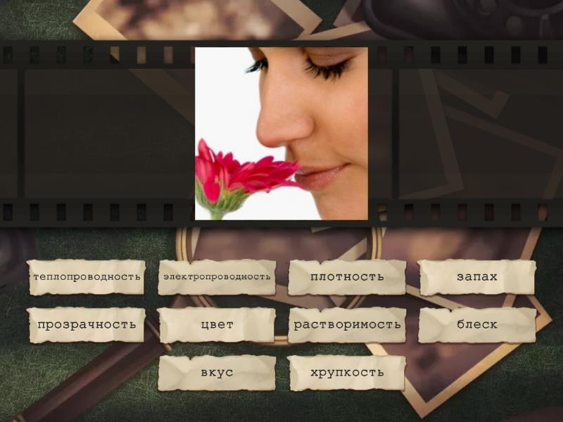 запах, блеск, хрупкость, вкус, прозрачность, электропроводность, теплопроводность, растворимость, цвет, плотность,