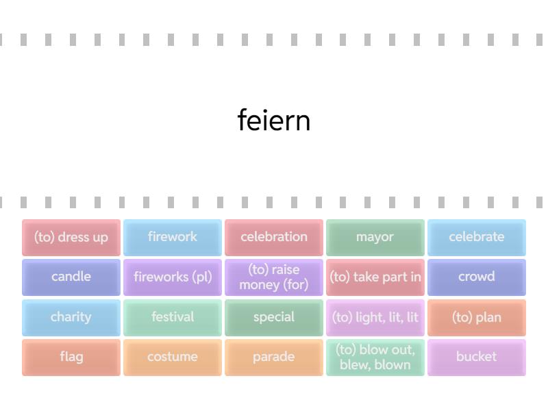 celebrate - feiern, celebration - Feier, parade - Parade, Umzug, mayor - Bürgermeister/in, (to) light, lit, lit - anzünden, candle - Kerze, (to) blow out, blew, blown - etwas ausputzen, ausblasen, (to) plan - planen, fireworks (pl) - Feuerwerk, firework - Feuerwerkskörper , (to) dress up - sich verkleiden , costume - Kostüm, Verkleidung , special - besondere (r,s), bucket - Eimer , crowd - (Menschen-) Menge, festival - Fest, Festival, flag - Fahne, Flagge, (to) raise money (for) - Geld sammeln (für) , charity - Wohlfahrsorganisation , (to) take part in - an etwas teilnehmen ,