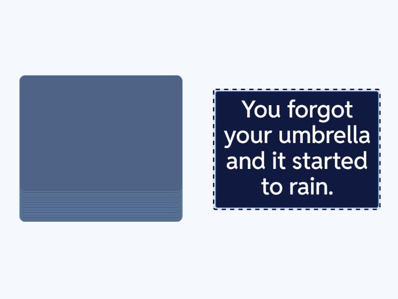 You missed the bus this morning., You drank three cups of coffee before class., You’re carrying a very heavy backpack., You bought a second-hand bicycle., You didn’t sleep well last night., You’ve been exercising every morning., You ate a whole pizza by yourself., You’re watching a documentary., You started learning a third language., You arrived late to a meeting., You forgot your umbrella and it started to rain., You’re going to the library this afternoon., You didn’t bring your charger to class., You’ve been saving money for months., You went to bed really early last night., You’ve started volunteering at an animal shelter., You took an online cooking course., You bought flowers on your way home., You are feeling super tired today., You skipped lunch..