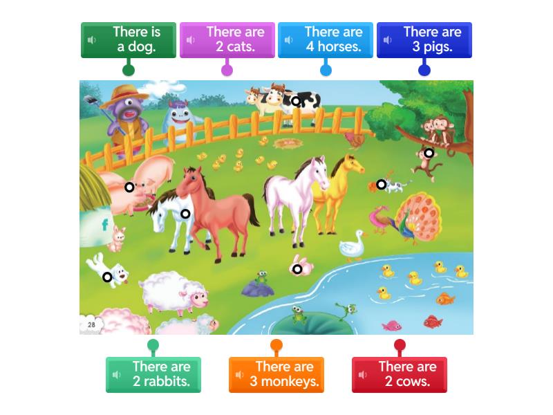 There are 4 horses., There are 2 cows., There are 3 monkeys., There is a dog., There are 2 cats., There are 3 pigs., There are 2 rabbits..